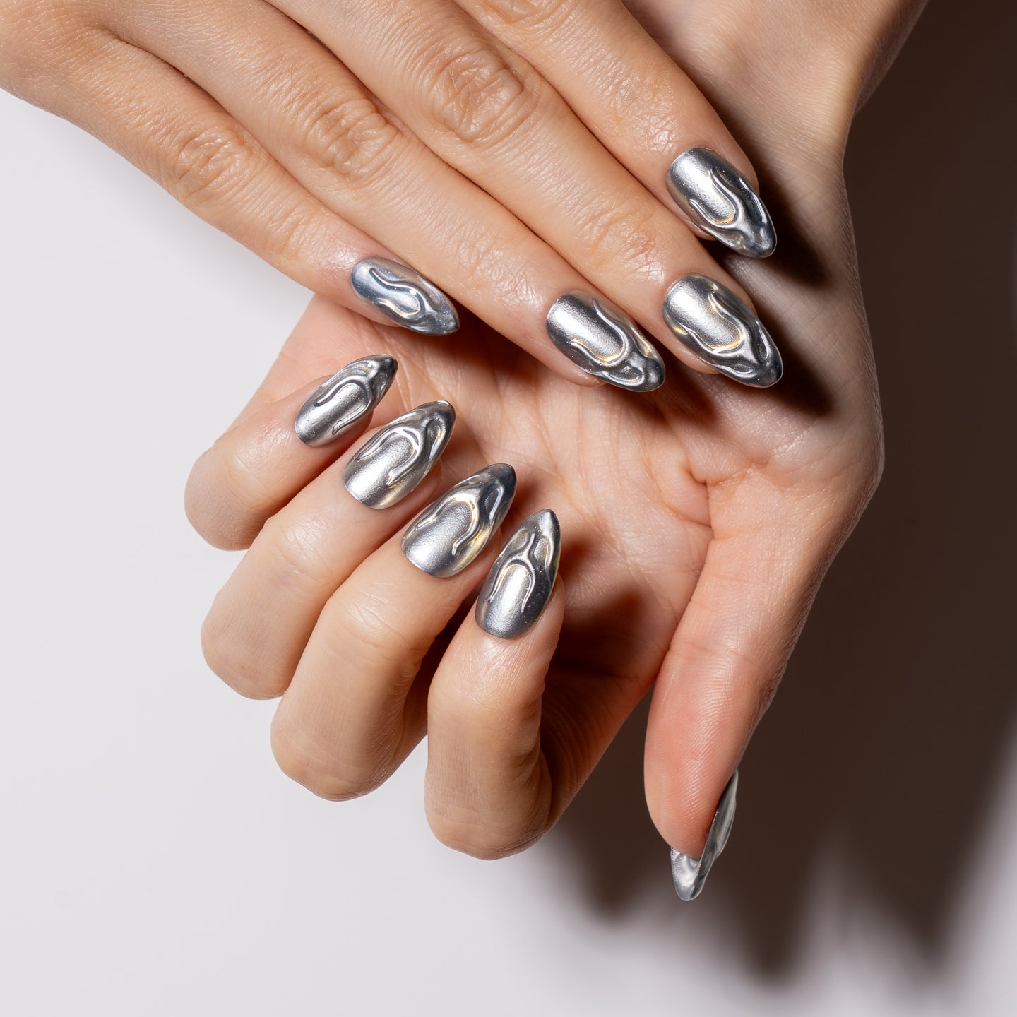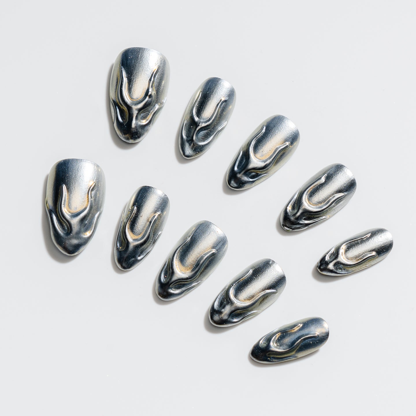 Sleek, sculptural, and futuristic Chrome Wave is a full silver chrome set with dimensional molten swirls. It's a bold, minimalistic statement perfect for modern muses.