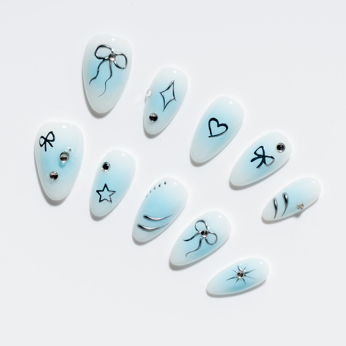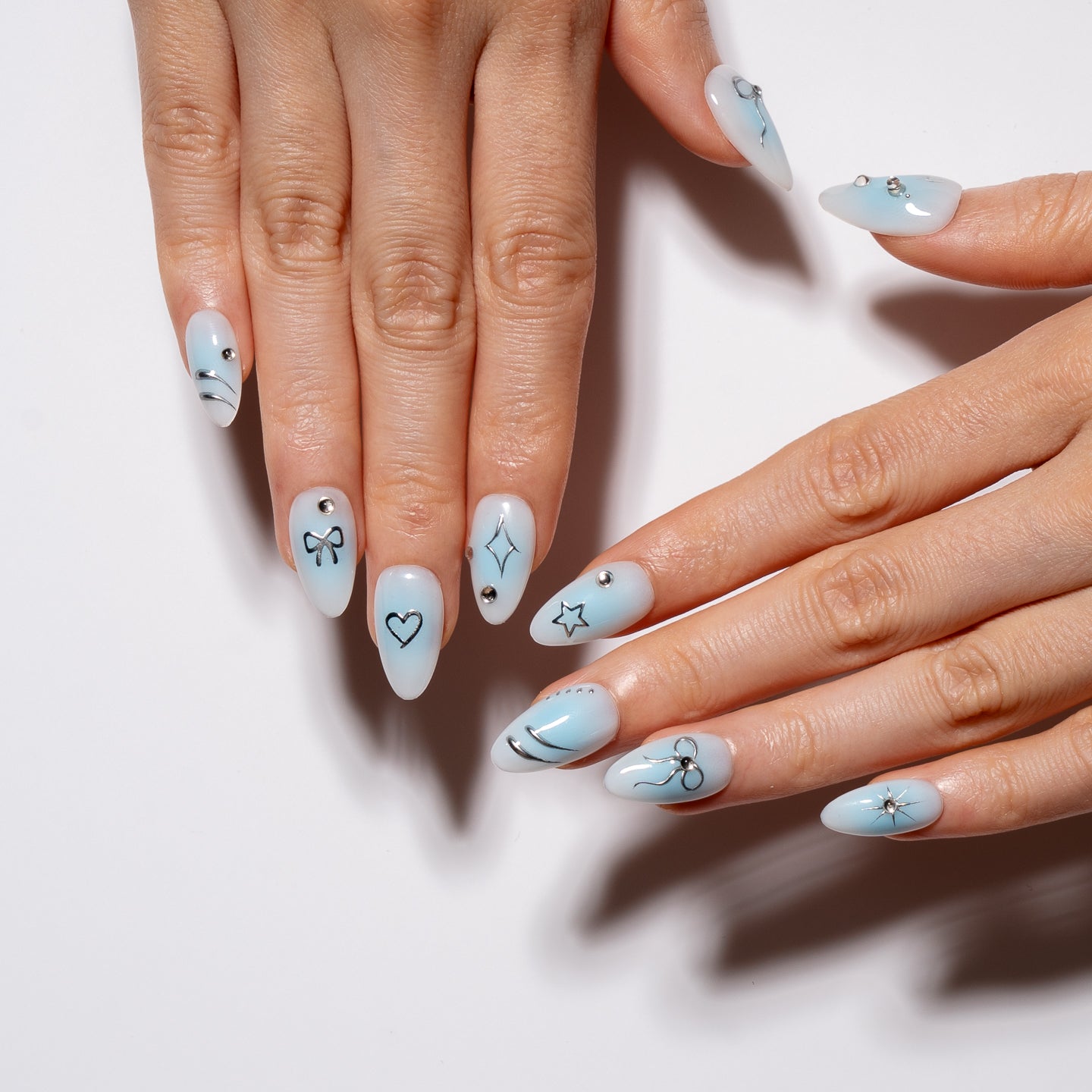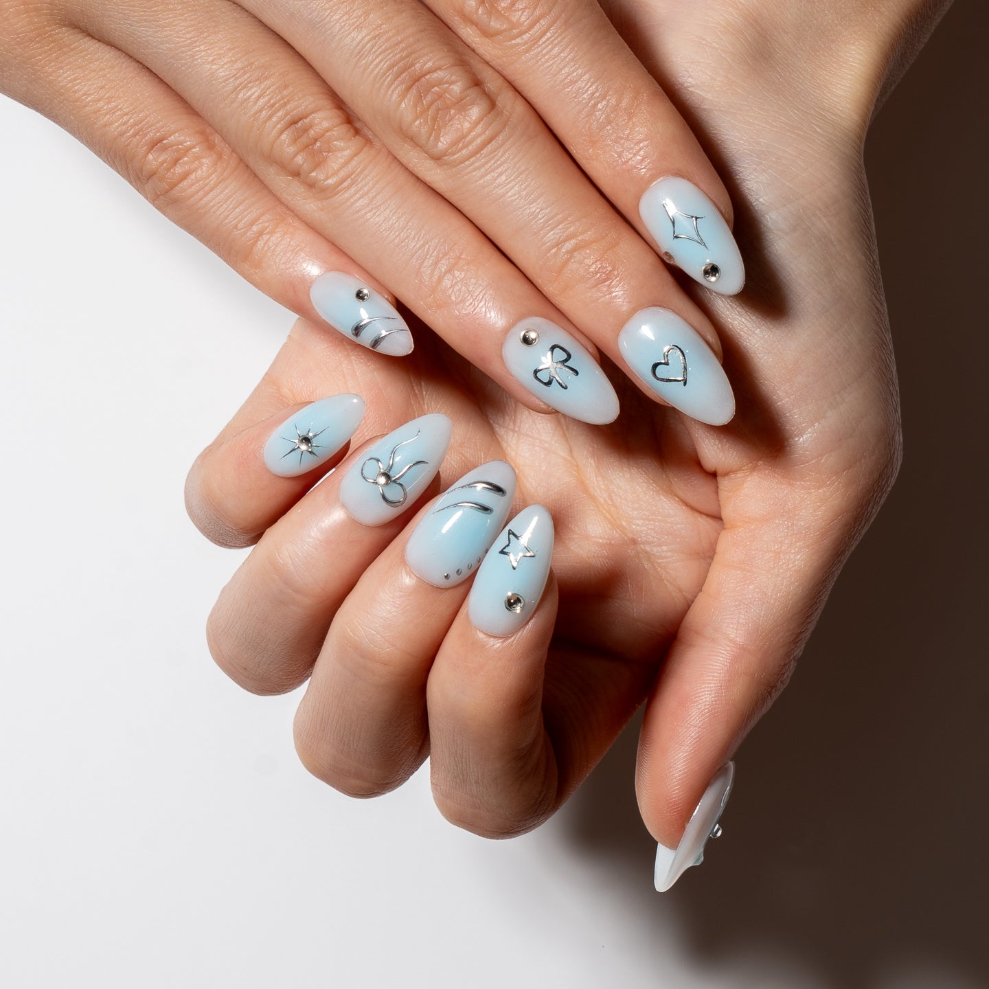 Nailly Cloud Pop turns playfulness into a palette. A white-to-blue ombre canvas with chrome hearts, stars, bows, and sketch-style icons creates a dreamy, Y2K-inspired set that's full of personality.
