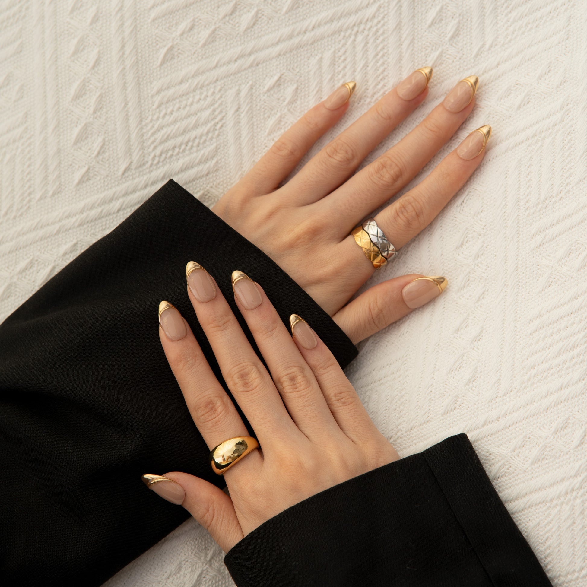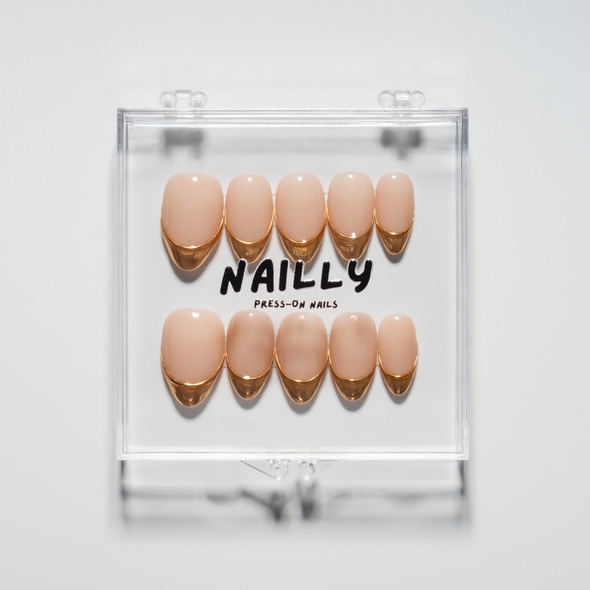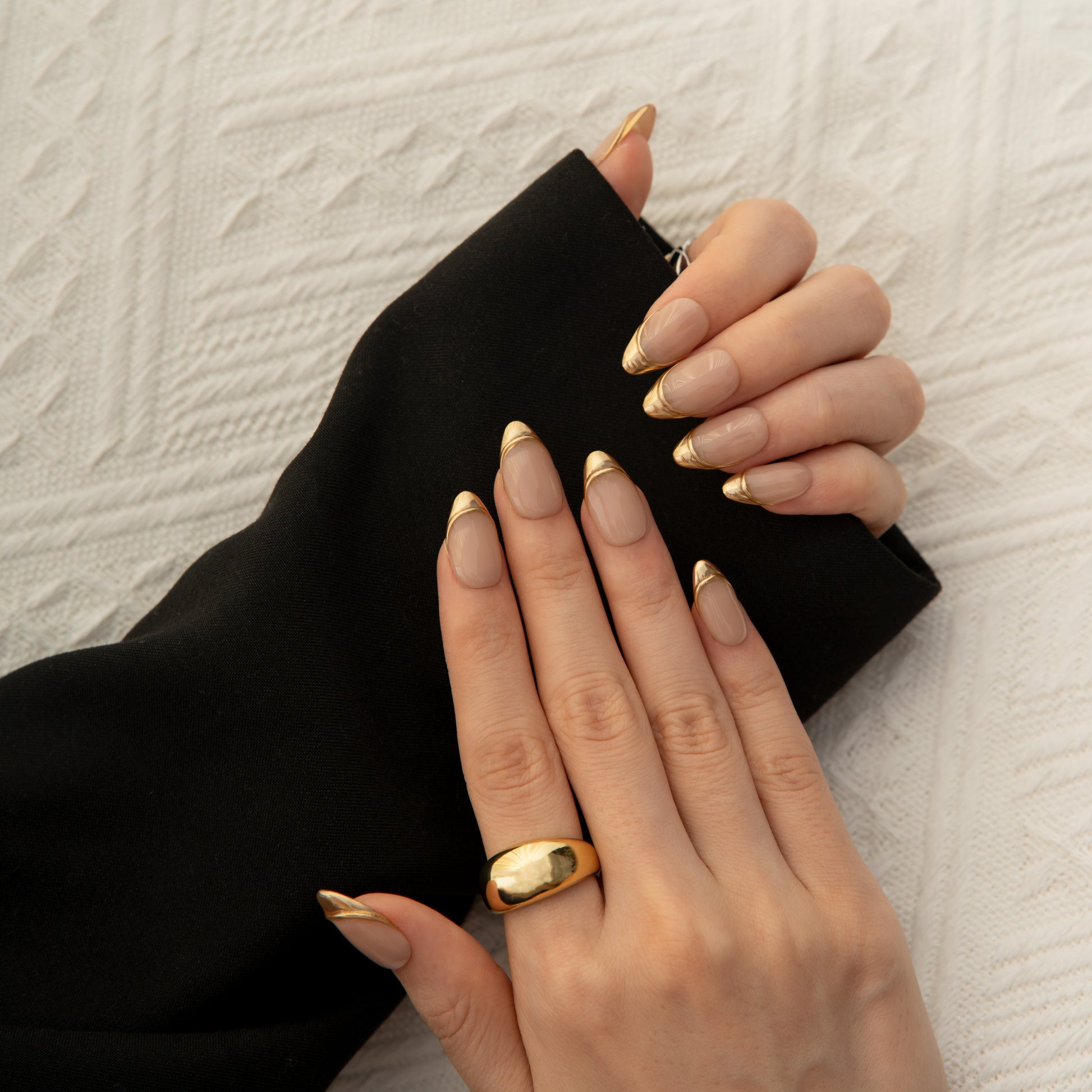 Nailly’s Golden Frame is a timeless nude French — reimagined. Sculpted almond nails wrapped in a molten gold cuff bring everyday luxury with a statement twist. Classic, clean, and rich in shine.