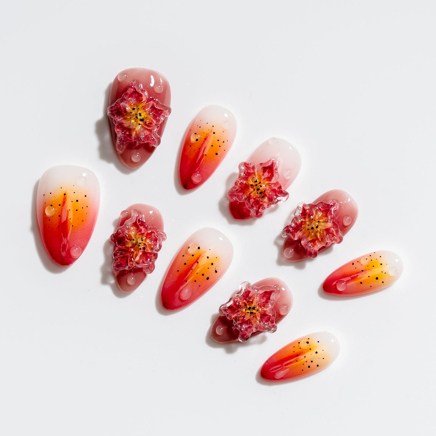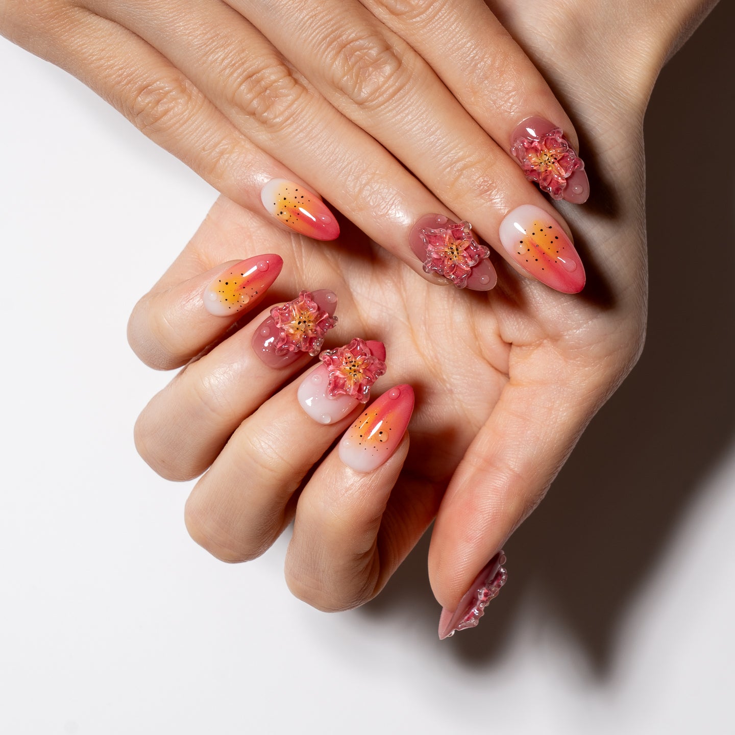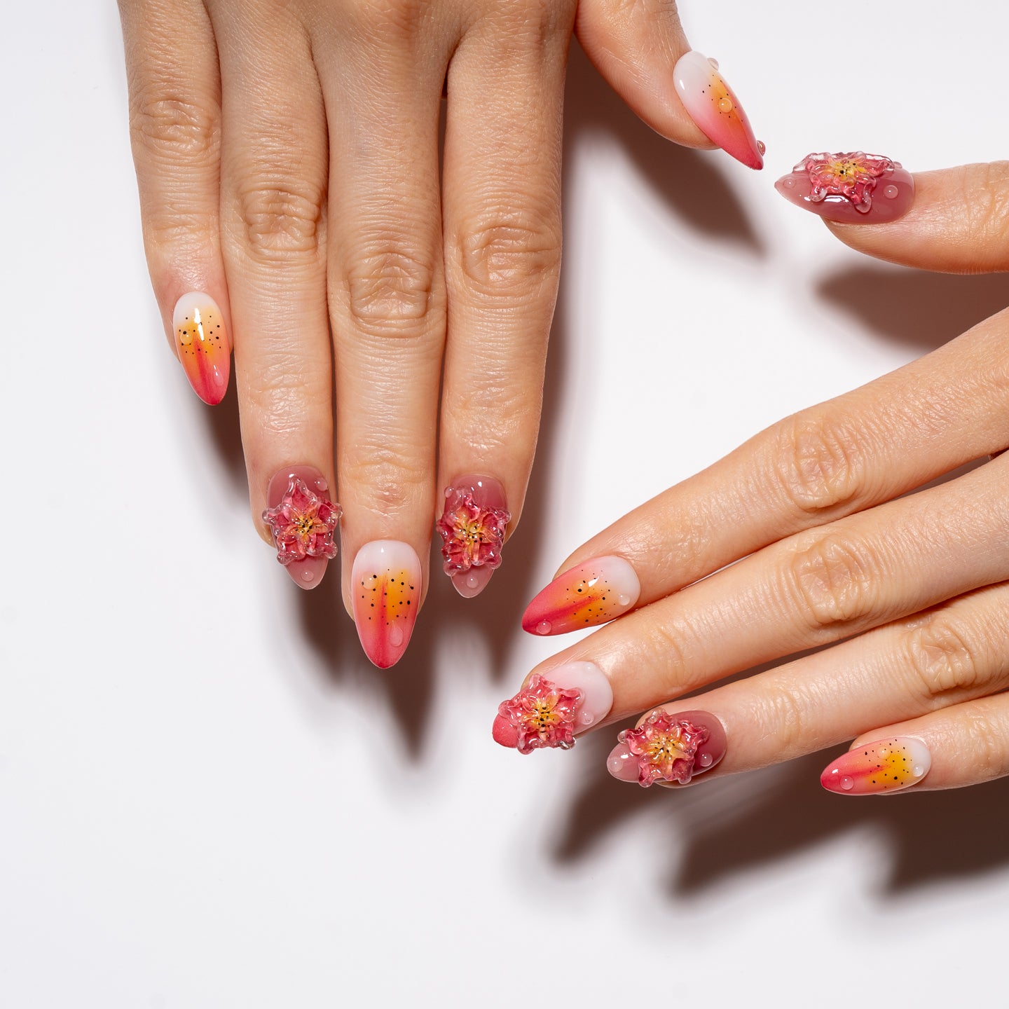 A tropical burst of colour with fiery ombre gradients and blooming glass-effect florals, Lava Bloom brings island energy to your fingertips. Bright, playful, and bold.