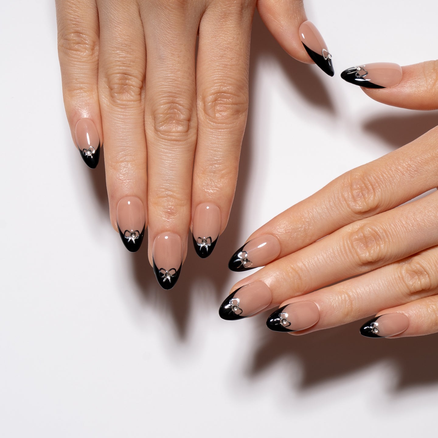 Nailly Midnight Bow is chic and sharp. A soft beige base contrasts against black French tips, each tied off with a dainty bow detail. Sleek, minimalist, and subtly bold, this set is for the ones who wear elegance like armour.
