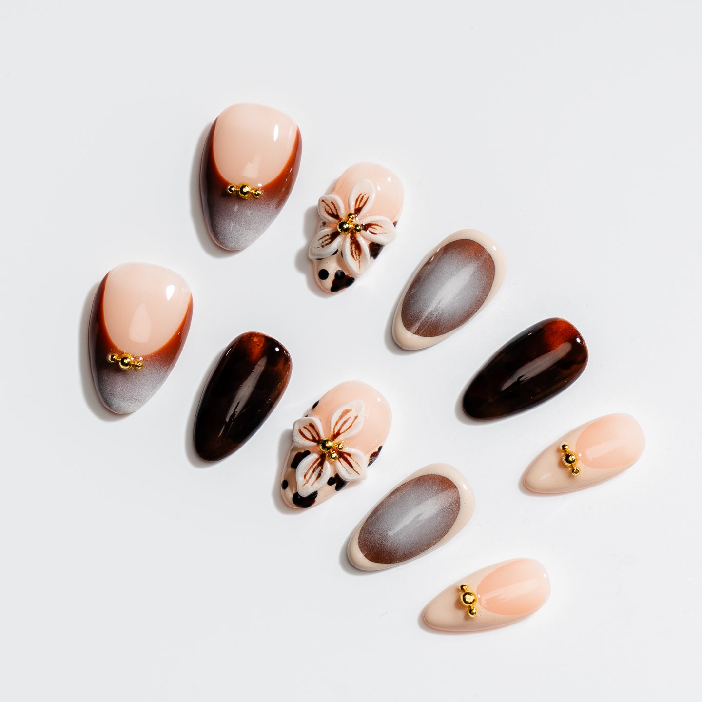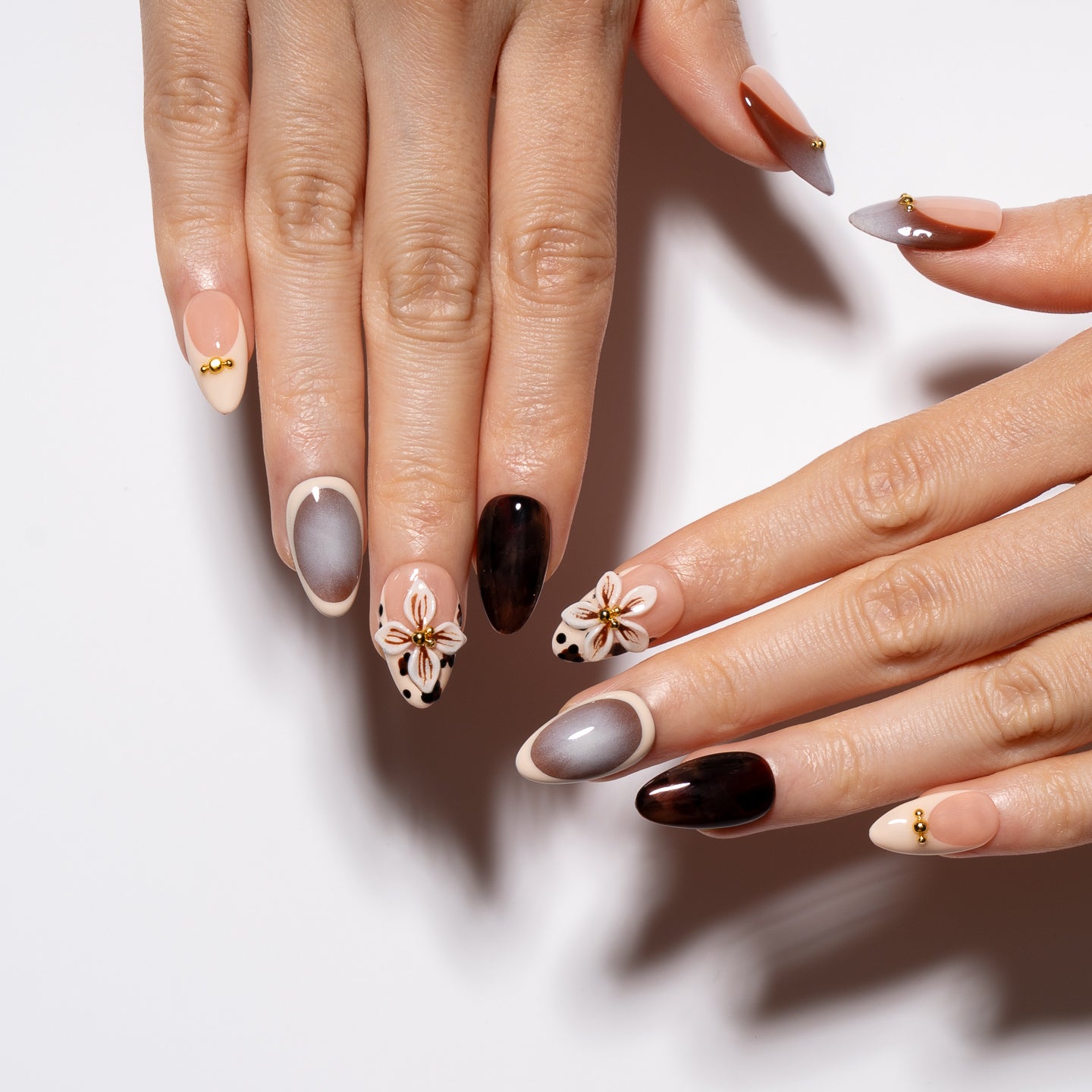 Nailly Mocha Petal blends coffee tones, petal-shaped 3D flowers, and ombre gradients into a nature-inspired statement. Elegant, earthy, and texturally rich, this is the set that turns neutral into a moment.