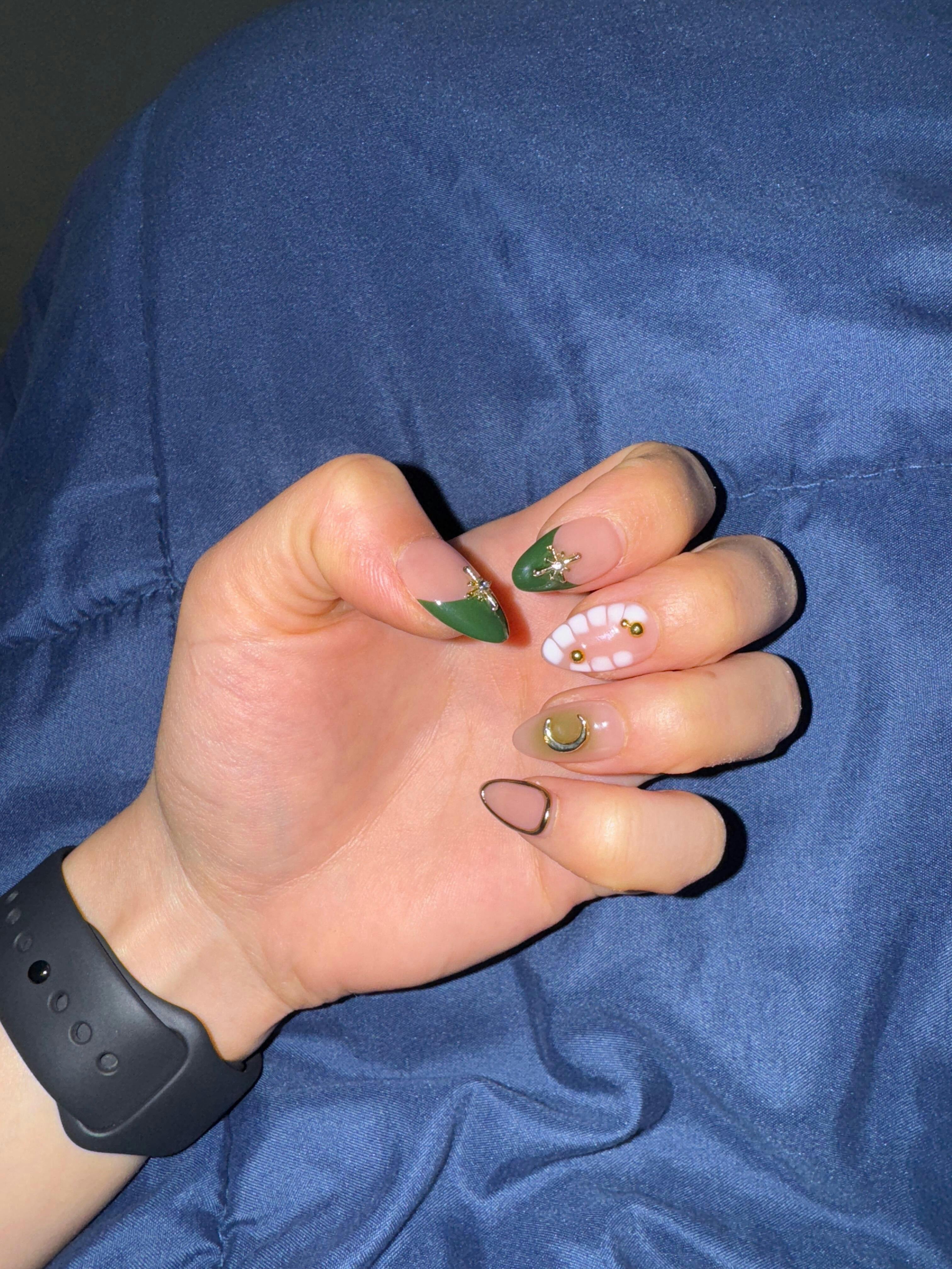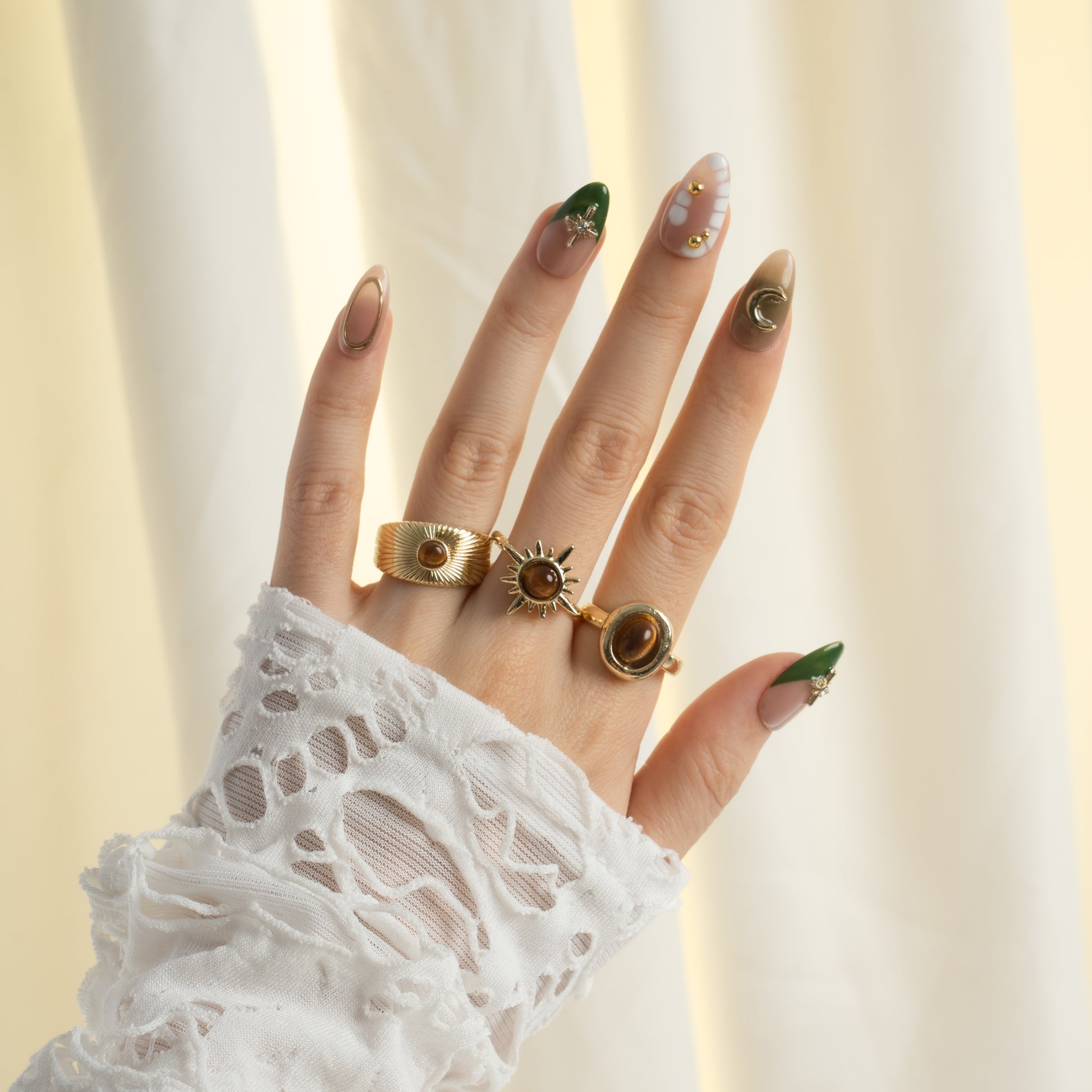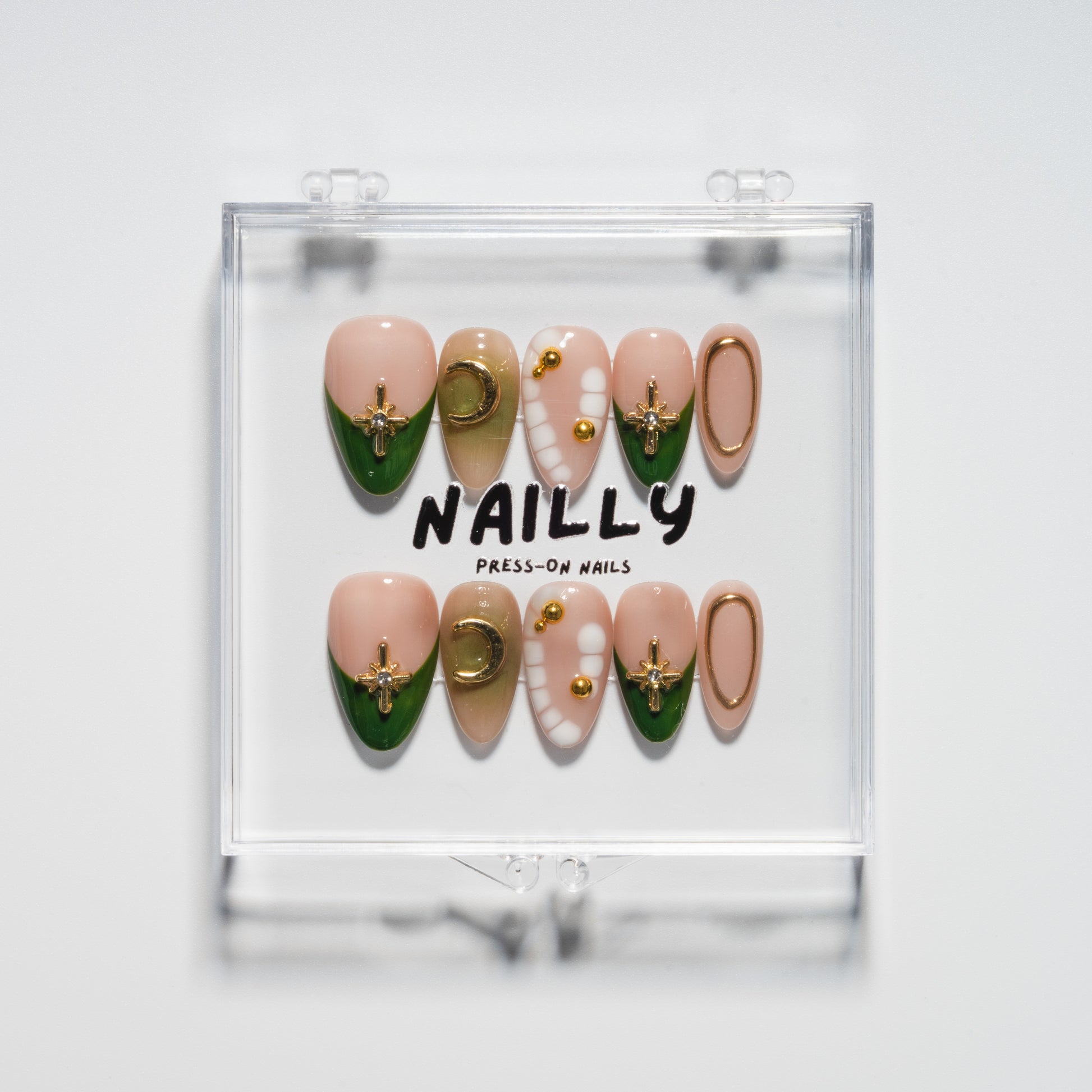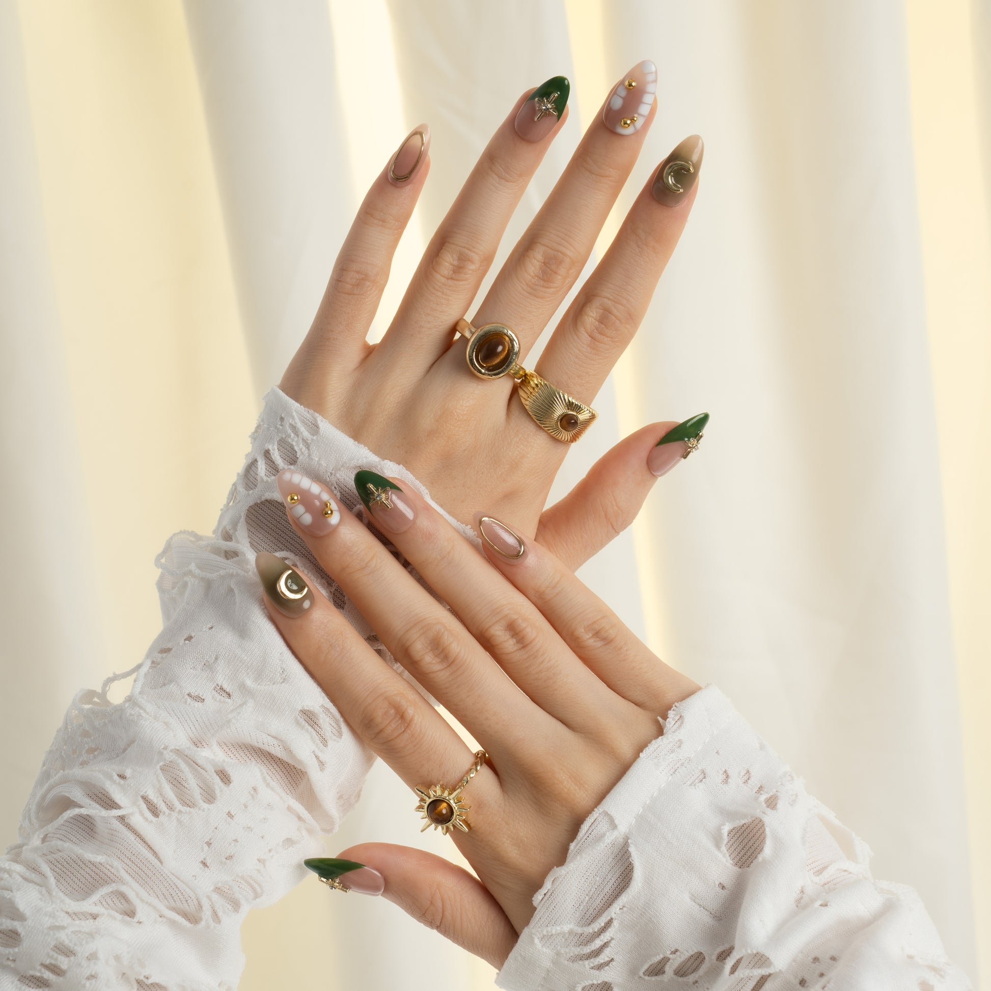 Nailly’s Mystic Forest is a moody mix of deep green, moonlight shimmer, and celestial gold accents. A mystical palette of stars, moons, and texture — perfect for nights when you feel most magical.