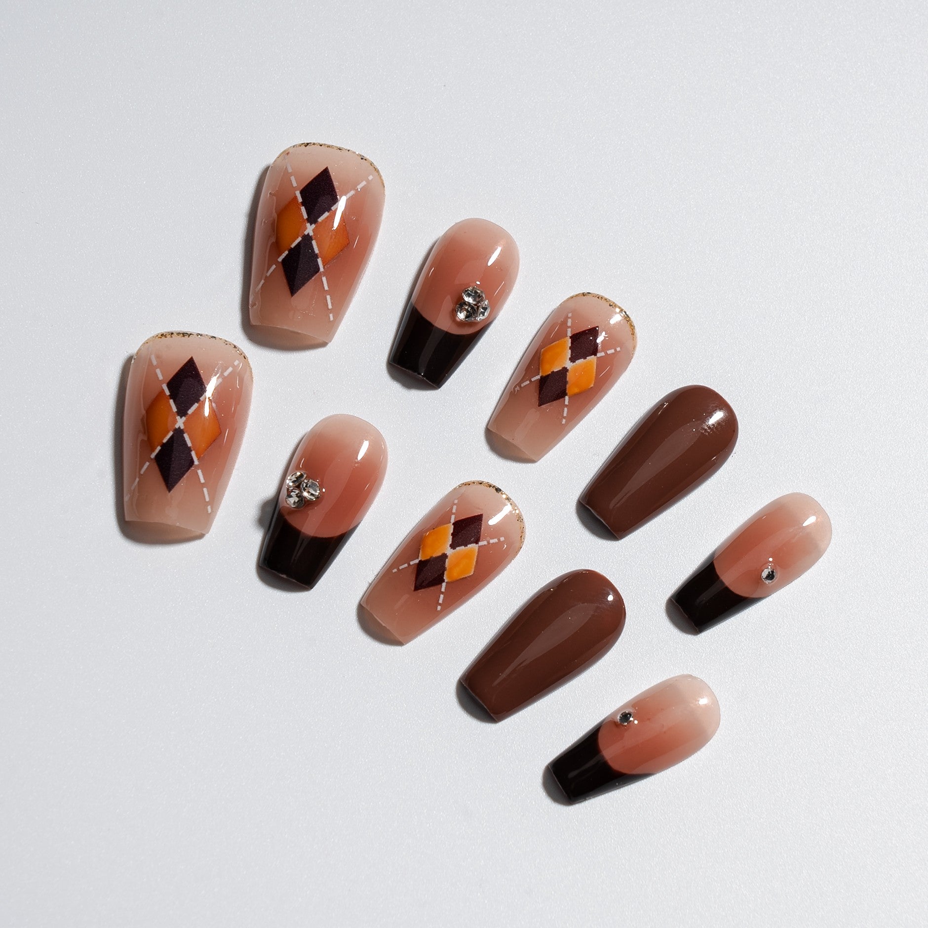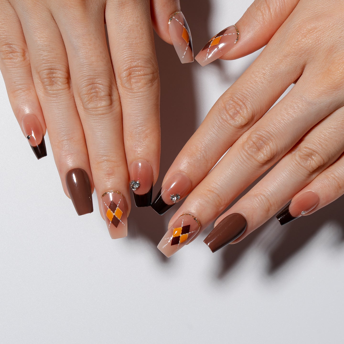 Nailly Preppy Plaid gives smart-girl chic with an autumnal twist. A warm caramel base plays host to dark brown French tips, accented with argyle diamonds and crystal studs. It is playful, studious, and totally statement-making, making it the ultimate accessory for your seasonal wardrobe.