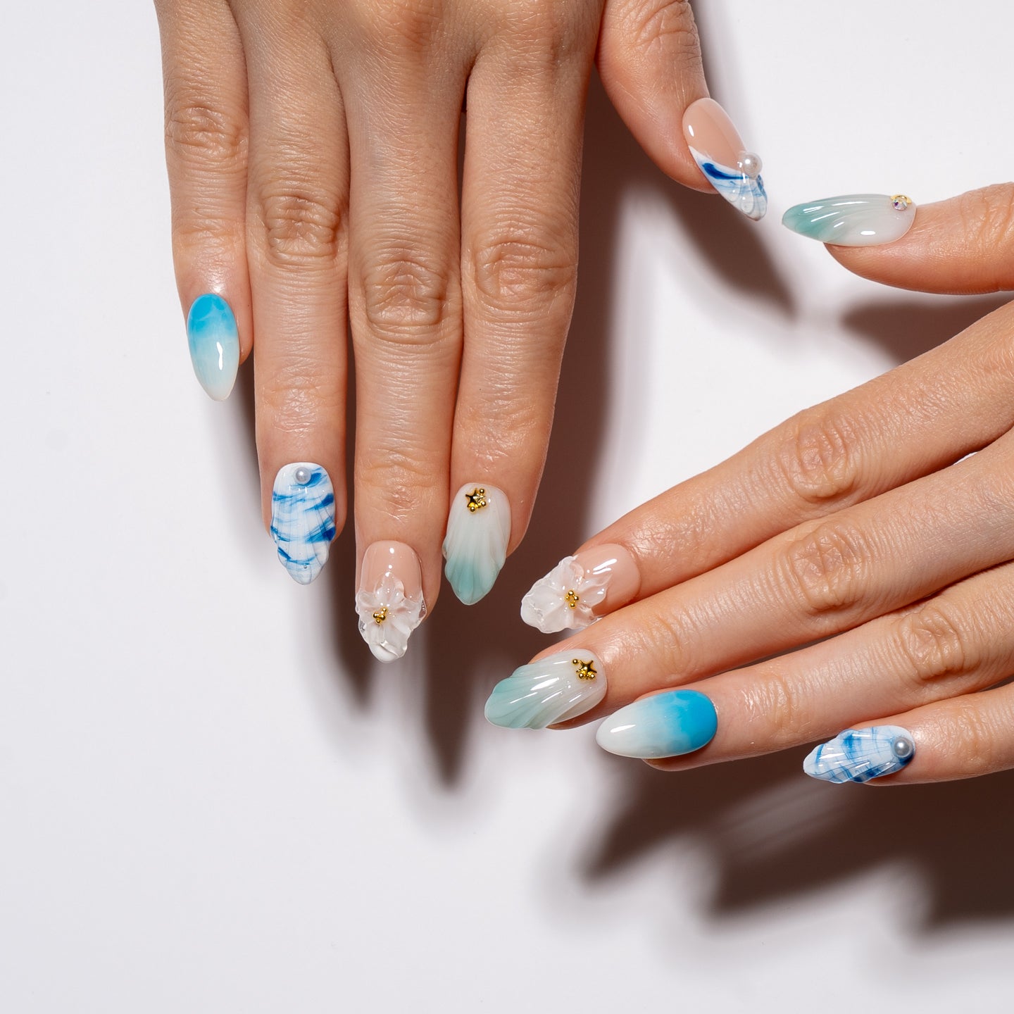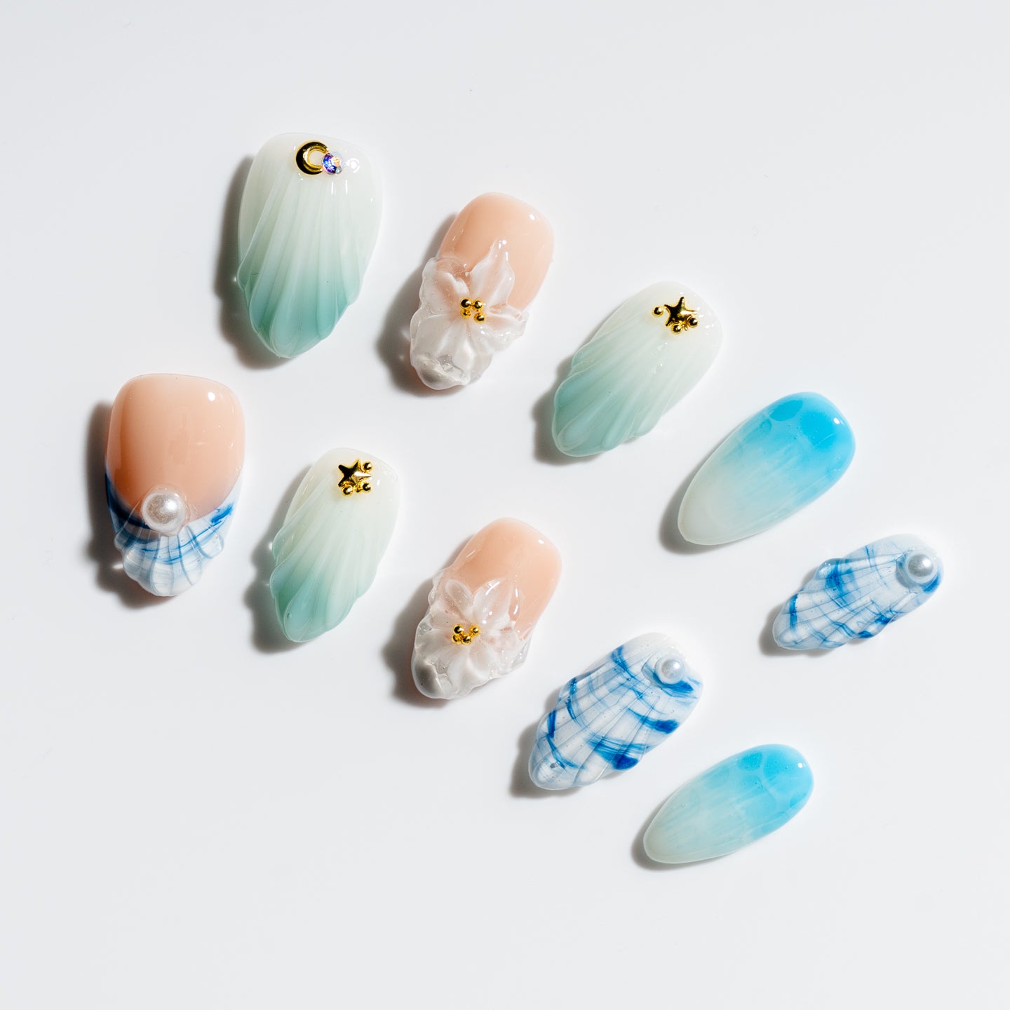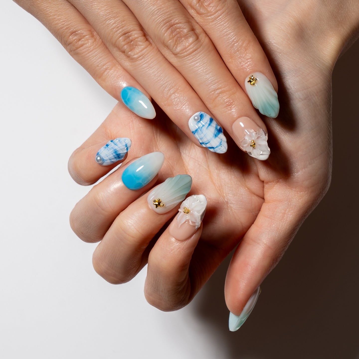 Nailly Seabreeze Bloom captures the essence of coastal charm. With shell textures, ocean florals, pearls, and delicate gold details, each nail feels like a keepsake from a dreamy summer escape.