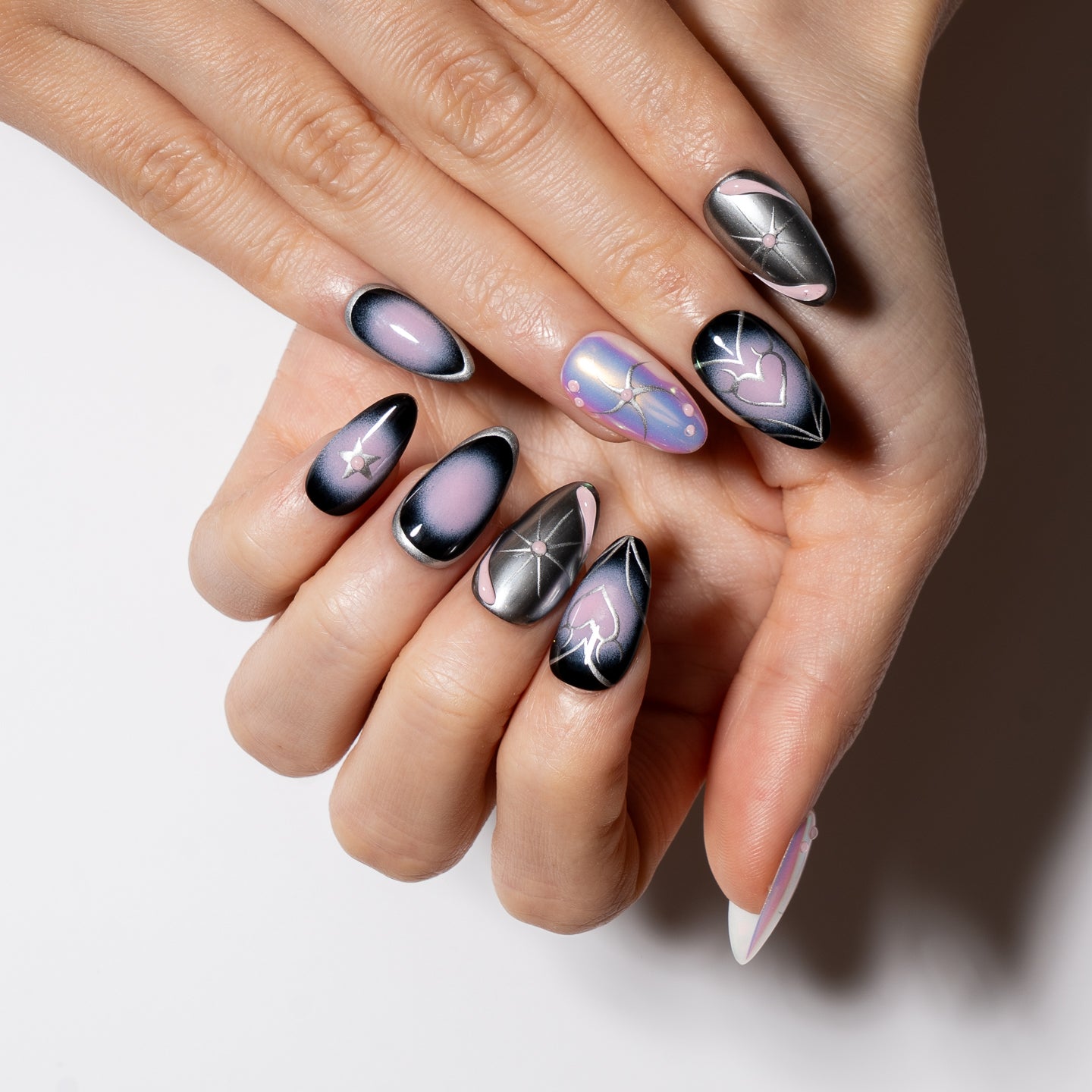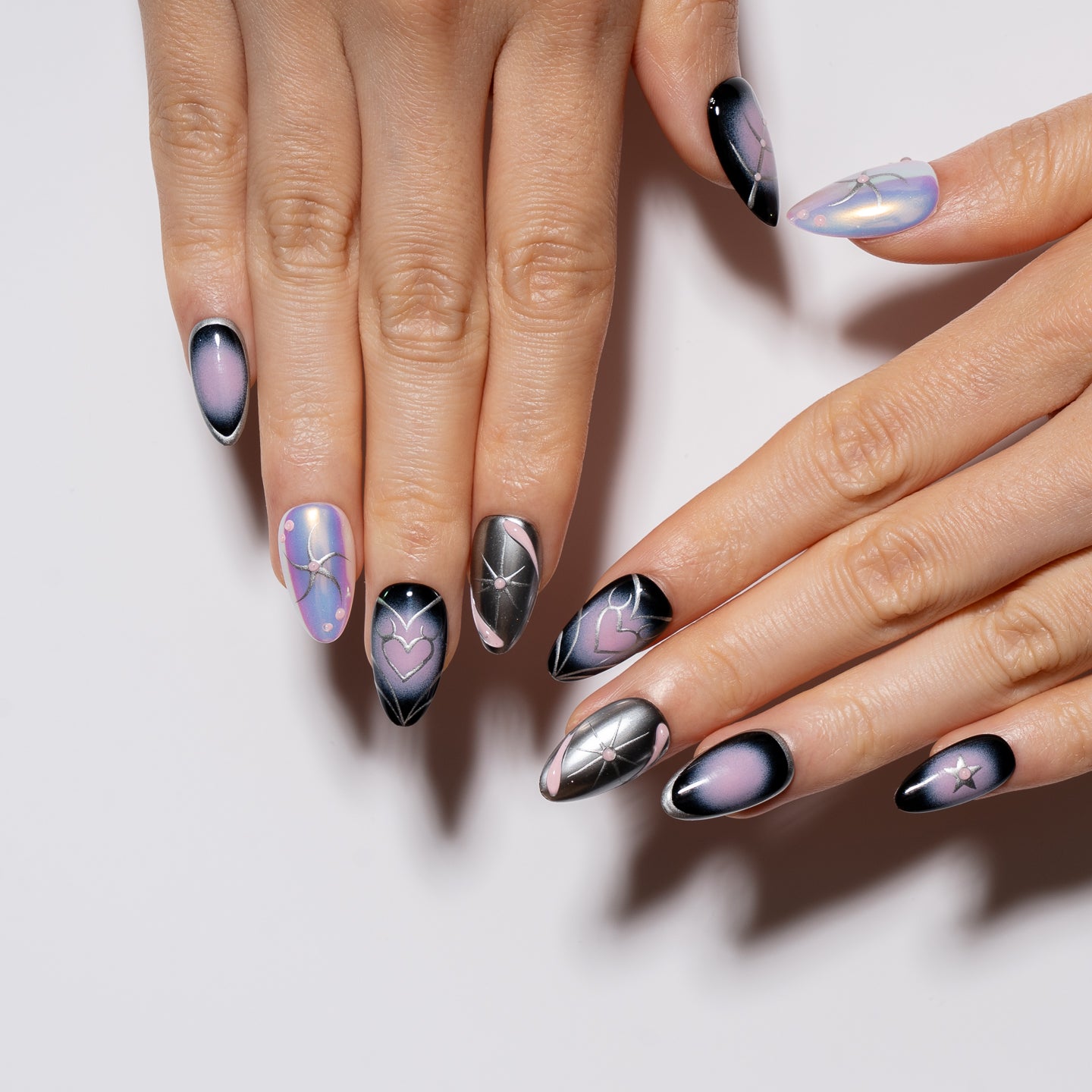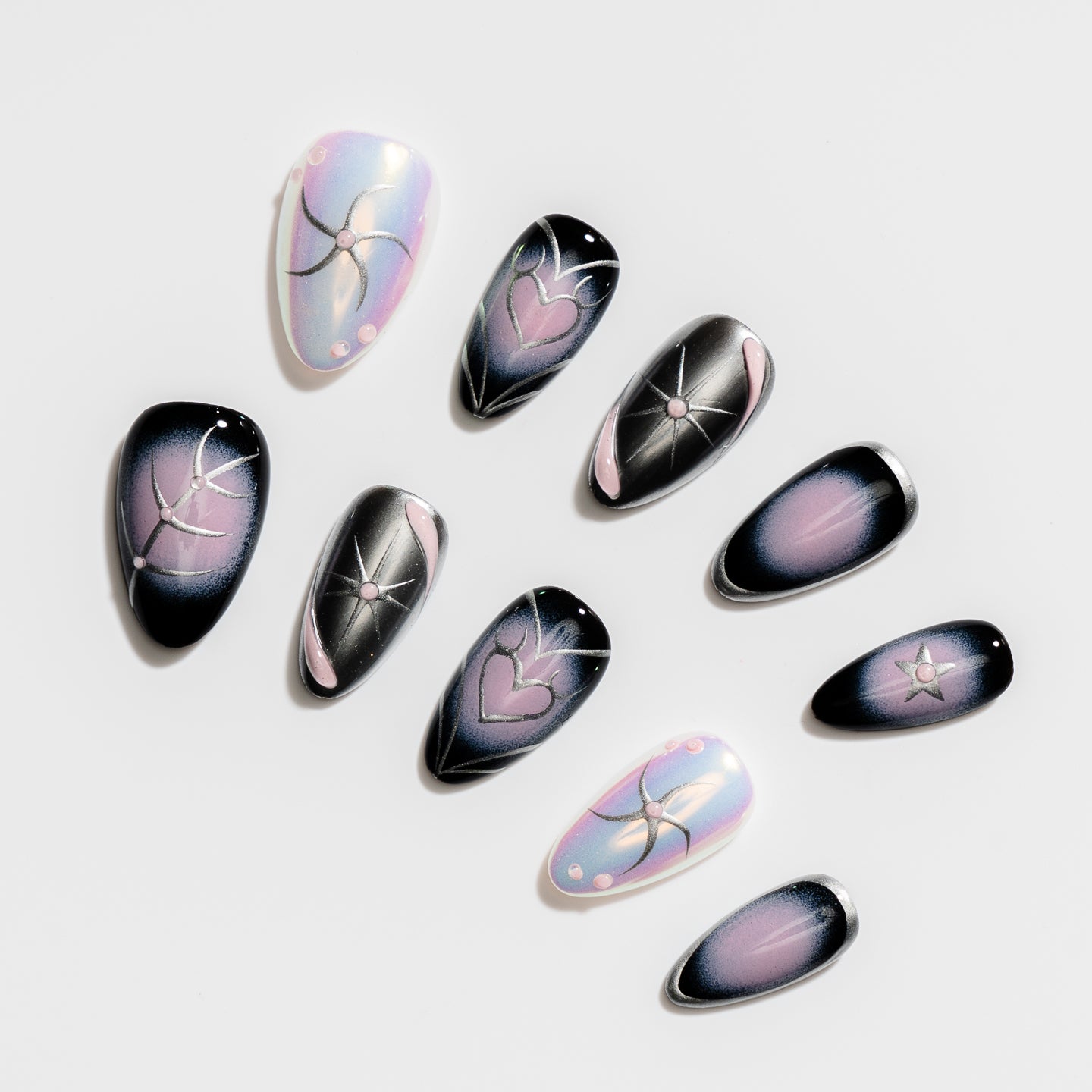 A dreamy fusion of twilight hues and silver constellations, Stargazer is for the cosmic romantics. Hearts, stars, and abstract swirls glow against galaxy blacks and pastel sheens - a set made to enchant.