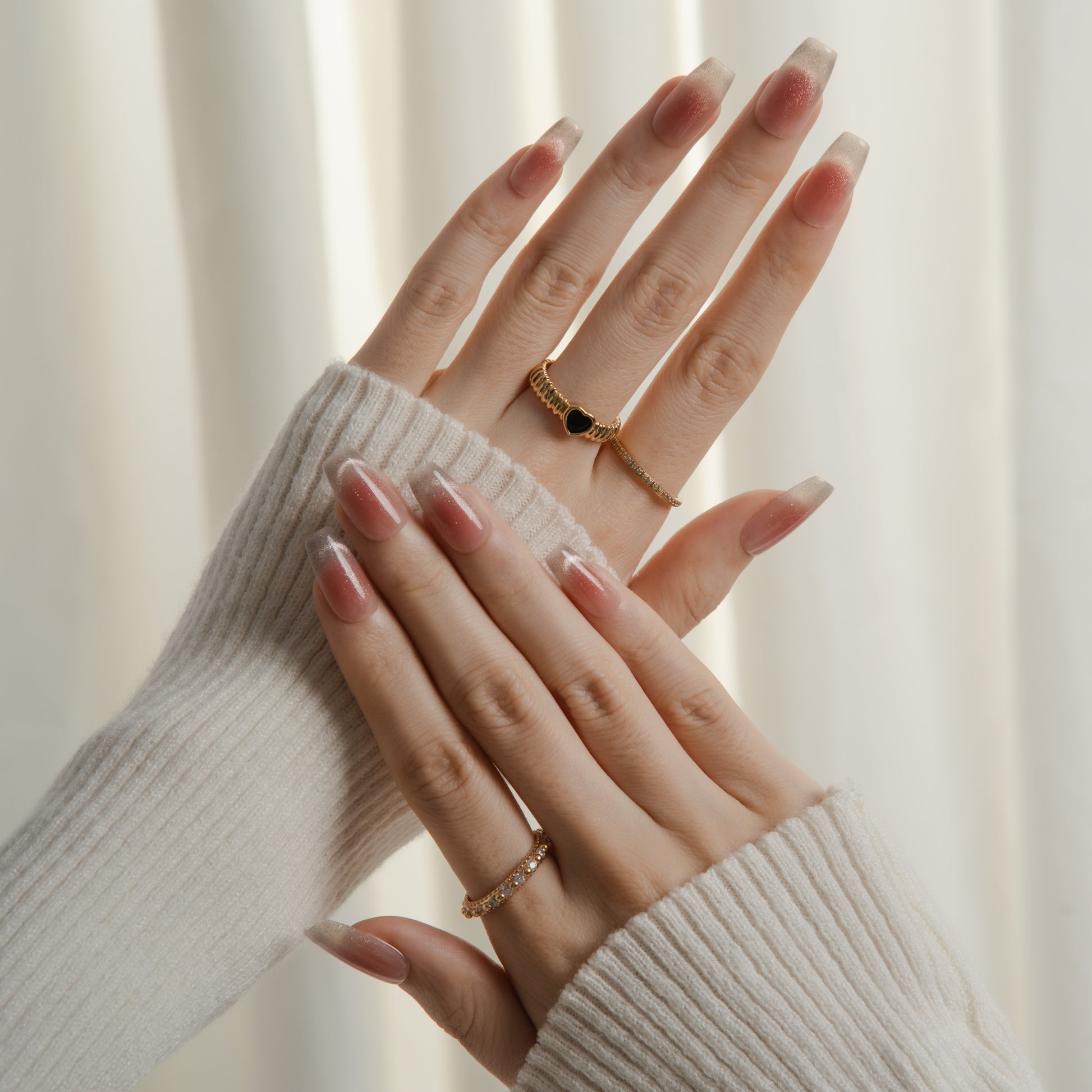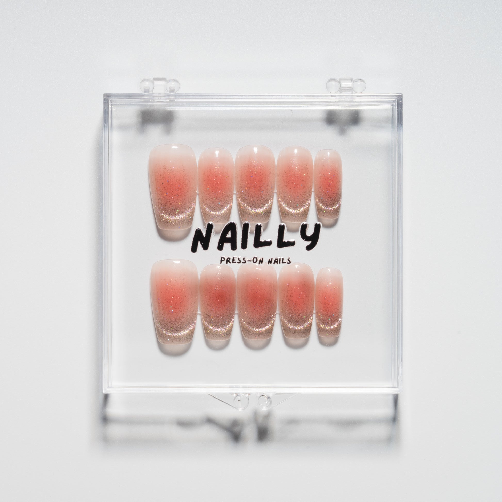 Nailly’s Sugar Glass is a glossy pink French fade with shimmering sugar tips. Sculpted in a natural square shape, it’s sweet, icy, and just the right amount of sparkle — like candy for your hands.